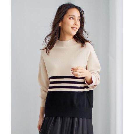シーズンレスで楽しめるモックネックニット■デザイン程よくゆったりとしたシルエットで、ボトムを選ばない万能バランスのモックネックニットです。やや立ち上げたモックネックでお顔周りが華奢見えするデザイン。着丈に前後差を付け、裾や袖口の内側に効かせた遊び心のある配色使いがシンプルながらにこだわりポイントです。同素材のパンツ(PRWMSW0451)や同シリーズのスカート(SKWMSW0451)とセットアップとしても着て頂けます。シャンパン×ブラック(133)はWEB限定カラーです。■素材ビスコースにストレッチが入った適度な落ち感のあるエレガントな素材です。シーズンレス素材で長く着ていただける素材です。着心地、肌触り、通気性も良く、上品な光沢感が特徴です。■同素材アイテムフレアスリーブニット(KRWMSW0457)パンツ(PRWMSW0451)