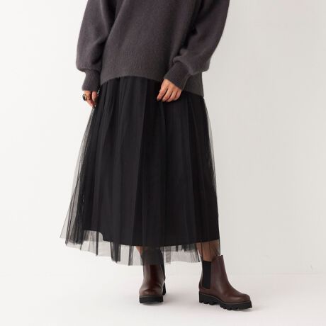 重くなりがちな秋冬のスタイリングもチュールスカートで抜け感のある印象に。