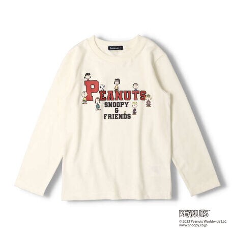 moujonjonからPEANUTS(ピーナッツ)オリジナルデザインのアイテムが登場!ロゴとスヌーピー、チャーリー・ブラウン、ウッドストック、ルーシー、マーシー、ライナス、サリー、シュローダー、ペパーミント パティのピーナッツの仲間たちのプリントが可愛い!安心の日本製でギフトやプレゼントにもオススメな長袖Tシャツ、ロンT。同じデザインの大人用、ママ用(F50853)があるので、親子でお揃い、ペアコーデ、リンクコーデも!【モデル撮影場所協力 STUDIO STEER】【アイテム】トップス カジュアル お洒落 オシャレ かっこいい かわいい 可愛い 普段着 デイリーウェア お出かけ着 お外着 お外遊び着 子ども服 こども服 男児 男の子 ボーイズ 女児 女の子 ガールズ 男女兼用 ユニセックス キッズ ベビーサイズ トドラーサイズ 幼稚園 保育園 小学校 通園 通学 小学生 2023年秋冬物新作 丸高衣料 ロングスリーブ 長袖 親子ペア 兄妹 姉弟 兄弟 姉妹 お揃い オソロ おそろい お揃いリンク リンクコーデ ペア シミラールック ママリンク ママリンクコーデ キャラクター コットン100% 綿100% made in Japan メイドインジャパン 国内生産 オフホワイト 白色 グリーン 緑色 ムージョンジョン