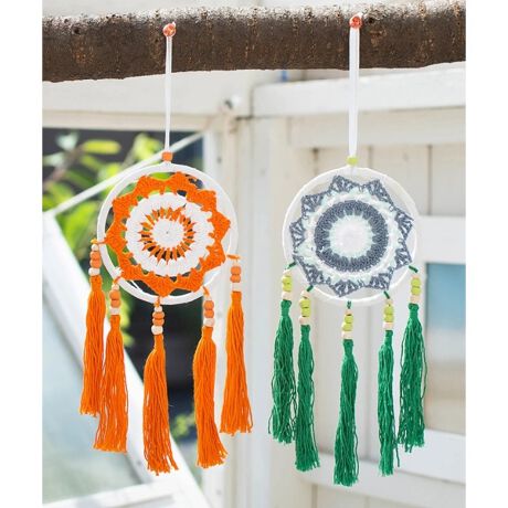 明るいカラーのクロシェットを組み合わせたドリームキャッチャーです。