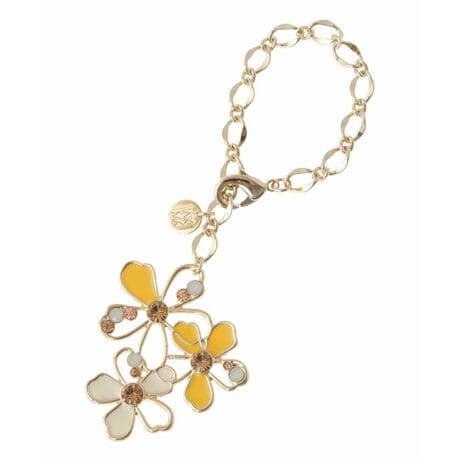 [型番:BKSAV01038]ビジューパーツの大人フェミニンなアクセントが目を惹くデザインチャーム。フラワーモチーフの三連デザインにコントラストカラーが映え、エレガントな雰囲気のお作りが魅力です。バッグやポーチに合わせて、華やかなスタイリングをお楽しみ頂けます。四色の魅力的なカラーバリエーションで贈り物にも最適なおすすめアイテムです。