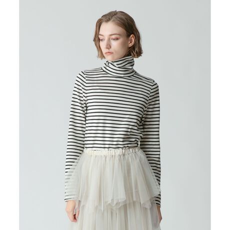細やかなボーダー柄がちょっぴり爽やかなアクセントになってくれる、タートルネックの長袖プルオーバー。暖かみのある素材感がこれからの季節に◎。トレンドのレイヤードにピッタリなボーダータートル。ウール混ならではの深みのある色味と、自然な艶があり女性らしくきれいに見える素材です。ハイネックニットの中にインして首元でレイヤードを見せていくのもお勧めです。ウォッシャブルでピリングしづらい特性があり、ホームケアのしやすい点もポイントです。一枚着はもちろんジャケットやニット、ワンピースなどとのレイヤードにもぴったりです。※手洗い可能です。フィッティングモデル(詳細画像)172cm B82 W66 H92 着用サイズ:02(M)
