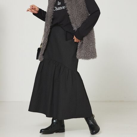 ポコポコと表面感のあるエンボス加工がポイントのティアードスカート。マーメードラインのティアードが今年らしい一枚。