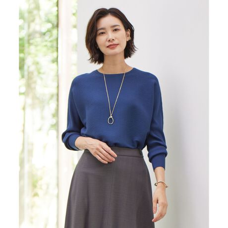 女性らしく優しいシルエットがポイントのドルマンスリーブニット。首まわりはスッキリとしたボートネックで、ネックレスと合わせたキレイめな着こなしもおすすめ。横使いのリブ目がコーディネートのアクセントに。程よい表情感のある、ふっくらとした素材は体のラインを拾いにくく、リラックス感のある着心地です。3つの釦を品よく並べ、バックスタイルも美しく仕上げました。シンプルなため、ボトムを選ばず合わせやすいデザインです。