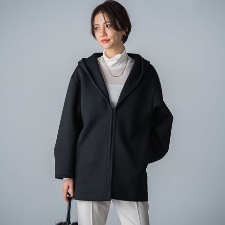 つづきのフードパーカータイプで、接ぎのない首周りですっきり見え。