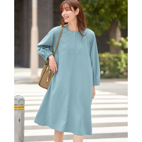 細かく斜めに走る畝が印象的なカルゼ調の生地をセレクト。ほのかに光沢もあり、砕け過ぎず、きちんとした雰囲気のワンピースになっています。ドット柄の刺しゅうを施した胸のヨークが単調なボディの良いアクセントになっています。膨らみを付けた袖のディティールもポイント。無地ベースのためアウターとのコーディネートも組みやすくアクセサリーを添えてオフィスやお子様と過ごす日にお召しになっても素敵です。お出かけに便利なポケット付きです。