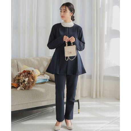 女性らしいシルエットのペプラムジャケットと、スタイリッシュなテーパードパンツの組み合わせは上品な華やかさを演出してくれます。