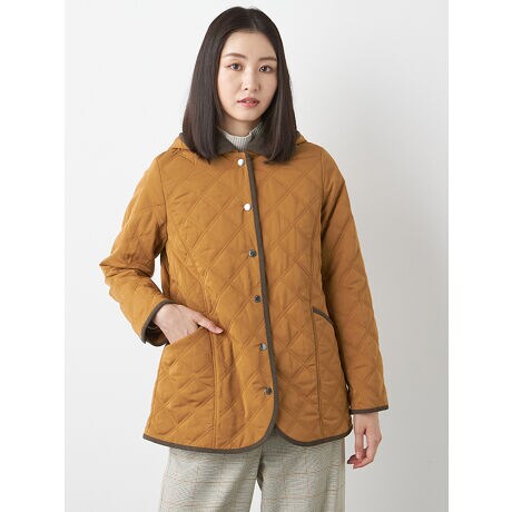 しなやかな微起毛したポリエステル素材にダイヤ柄Wステッチを施した中綿入りライトジャケット。別布でコーデュロイの丸襟をアクセントとし、大人のソフトトラッドを表現。お尻が隠れるレングスで、暖かさがキープできる万能丈にしています。フードもドットで簡単に取り外しができ、2通りの着こなしが楽しめます。また、撥水加工を施しているのも嬉しいポイントです。