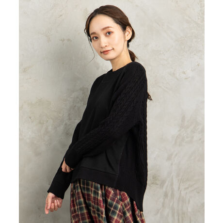 立体的に編んだケーブルにニットと、裏毛プルオーバーをドッキングしたデザイントップス、コンビトップス。