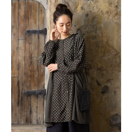 それぞれ大きさの異なるドットプリントと無地をパッチワークしたコーデュロイワンピース。