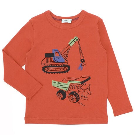 男の子にクレーンカーとダンプカーをプリントしたのロングTシャツ。