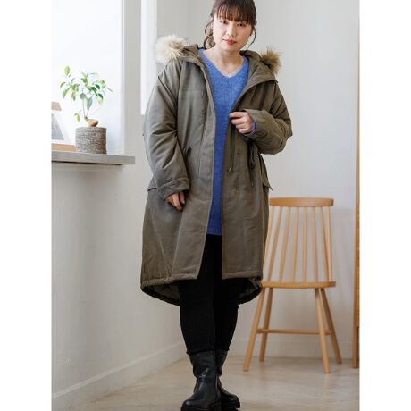 ふっくらとした中綿入りで、あたたかく着用出来るモッズコート。