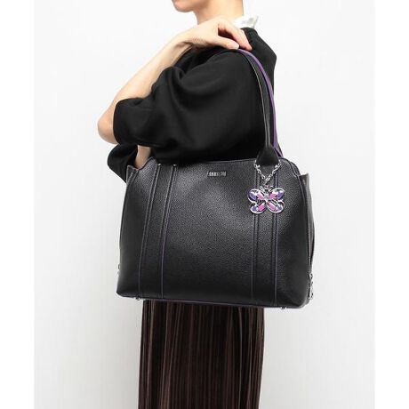 シンプルなデザインでスタイリングに合わせやすいラウラシリーズ。コバを効かせているのがポイント。ブラックにはパープル、ターコイズにはブルーのコバが程よいアクセントになっています。ちらりと見える花柄の裏地もキュート。付属でカードケースが付いており、バタフライチャームも取り外し可能です。A4サイズ収納可。