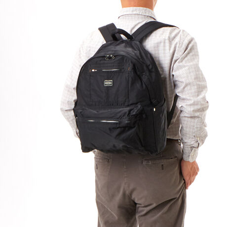 デイパックはシンプルなデザインながら、外装に複数のポケットを備えた機能的なアイテムです。前面上部のポケットは、ワイヤレスイヤホンなどの収納に適しています。メイン収納部はワンアクションでファスナーを開閉できる仕様で、中の荷物を簡単に取り出すことができます。