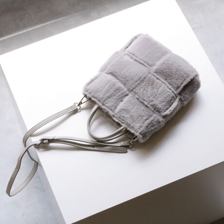 人気のイントレチャートの技法を手触りの良いエコファーで仕上げたモコモコかわいいショルダーバッグ。