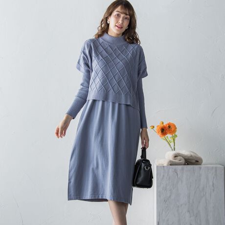 ニットワンピースとニットプルオーバーをレイヤードさせたセットワンピース。