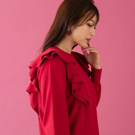 ボリュームのあるフリルを2枚重ねた可愛い存在感を放つニットプルオーバー。