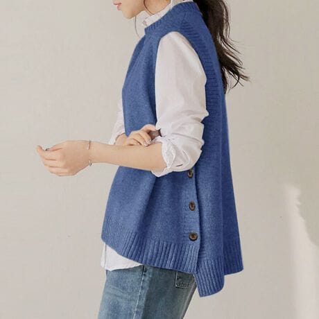 大きく開いたスリーブ部分は、ボリューム感のあるスリーブのトップスとも相性抜群のデザイン。両サイドにボタンが付いていて、目を引くワンポイントに。