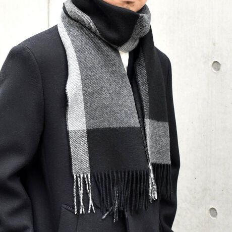 男性だけでなく、女性にもオススメのベーシックなパネル柄マフラー。