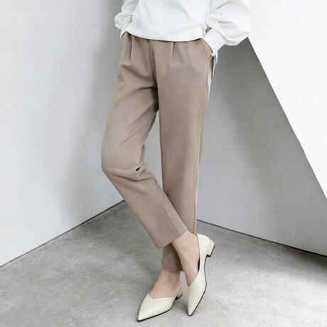 裾に向かってテーパードさせた華奢で女性らしいラインに、ウエストゴムで自然なラフさが表現され、 すっきりとしたコンパクトなパンツスタイルを叶えます。