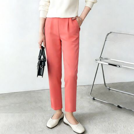裾に向かってテーパードさせた華奢で女性らしいラインに、ウエストゴムで自然なラフさが表現され、 すっきりとしたコンパクトなパンツスタイルを叶えます。