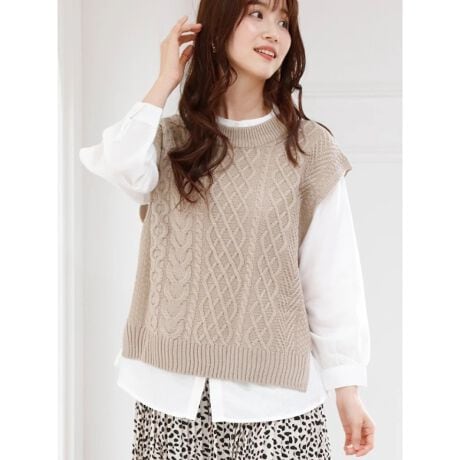 レイヤードコーデが即楽しめる、ケーブル編みのベストとシャツの2点セット。