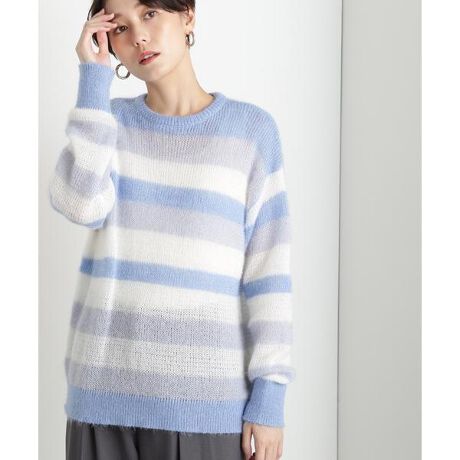着こなしのアクセントになる3色使いのボーダーと、ふわふわのシャギーニットを組み合わせた一枚。襟ぐりはシンプルなクルーネック、身頃はゆったり感のあるリラクシーなシルエット。大人のカジュアルスタイルにぴったりで、マニッシュなパンツやボリュームスカートなどと合わせれば、違った雰囲気で着ていただけます。