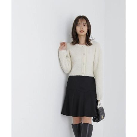 【商品特徴】プロポーションオリジナルのツイード素材を使用したミニスカート。ヒップから裾に向かってフレアを作り、女性らしいシルエットに仕上げています。曲線の効いたカーブラインの切り替えカッティングも可愛らしいアクセント。今年らしいミニ丈シルエットを大人っぽく演出してくれます。【スタイリング】シンプルニットはもちろん、フェミニンな雰囲気のニットとも相性バツグンです。ロングブーツを履くと好バランスに決まります。