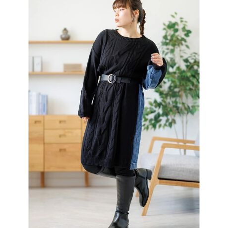 デニムの異素材切り替えが個性をプラスするニットワンピース。