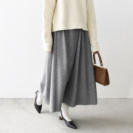 ウエストはゴムですが、ボリュームを極力抑えたデザインにしているのでオーバーサイズのニットももたつかず、タックインも決まるアイテム。