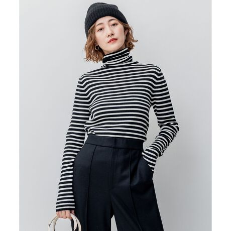 ウール100%のシンプルで汎用性のあるリブタートルネックプルオーバーです。無地とボーダーの豊富な6色展開。後ろ襟ぐりに入ったスリットがポイントです。袖丈はやや長めにしているのでシャツやニットのレイヤードにもオススメです。カラーは、ボーダーがブラック×オフボーダー(#105)、ブラック×マリンボーダー(#174)、無地は合わせやすいアイボリー(#002)、グレー(#004)、シックなブラック(#005)、柔らかい印象のベージュ(#033)の計6色展開です。