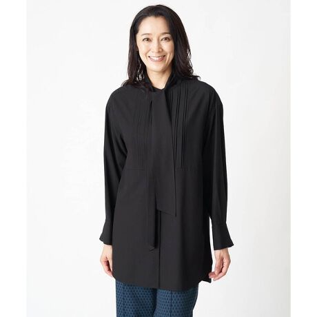 ボウタイは取り外しができる仕様で、その日の気分や合わせるアイテムによってアレンジできるので、コーディネートの幅がぐっと広がります。素材の滑らかさを活かしたゆったりめのサイズで、体型の気になる部分をさりげなくカバーしてくれるところも高ポイント。前身頃に太めのピンタックを施し、袖口と衿には小さなメタル釦が付いていて、洒落感を演出してくれます。