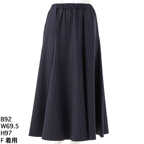ウエストゴムで快適な穿き心地のピンストライプフレアースカート。