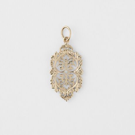 植物モチーフを組み合わせた紋章のようなフォルムに透かし模様をデザインしたチャーム。縦長で面のあるフォルムは重ね着けのベースとしても活躍してくれます。エシカルなK5素材を使用しボリューム感にこだわりました。※チェーンは別売りです。※天然石や天然素材を使用しているものは、サイズ・色味・風合いの違いや、若干の傷、内包物の有無などに個体差があります。予めご了承ください。