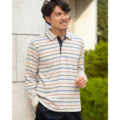 冬のボーダーポロシャツです。保温効果のある起毛鹿の子生地を使用しています。やわらかく、抜群の暖かさが特長です。明るい配色のボーダーが、インナーとして着合わせのアクセントになるアイテムです。