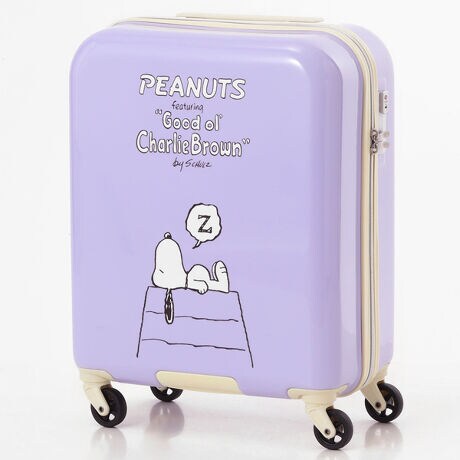 すやすや寝ているスヌーピーとラベンダーの配色がかわいいスーツケース