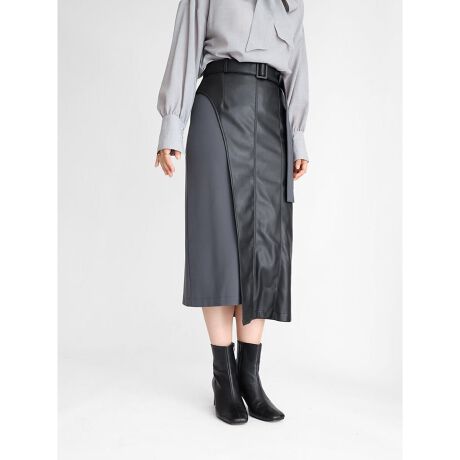 曲線にカットされたヴィーガンレザーから異素材が覗くデザインでモードな雰囲気のスカート。ワントーンのカラーも異素材切替えやサイドの大きめなポケットで程よいアクセントに。アクセサリーや差し色で女性らしい要素をプラスし、ハードすぎず大人らしく着こなして頂くのがおすすめです。