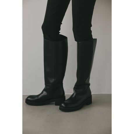 やや光沢感のあるフェイクレザーを使用した上品なジョッキーブーツ。シンプルなデザインで長く愛用できる一足です。上部分がカービーラインになっていて、内側を深いカーブにすることで、脚がスッキリと華奢に見えるデザインがポイント。ラウンド型のつま先で程よくカジュアルさもあり、幅広い方に着用頂きやすいブーツです。