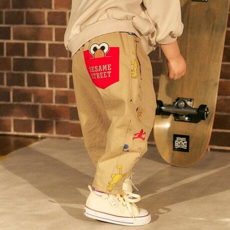 【セサミストリート オリジナルデザイン】ボリューミーなシルエットがコーディネートのアクセントになるパンツ。ポケットにエルモやクッキーモンスターがいたり、サイドの切替部分にエルモたちの総柄プリントがされていたりと、細部までこだわりを詰め込んだデザイン。ウエストゴムで履きやすいのもポイント。