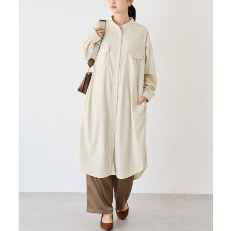 バンドカラーとキメの細かいコーデュロイ生地で、カジュアルすぎず上品見えする仕上がりに。厚手過ぎず、重ね着もしやすい肌触りの良いソフトな風合いです。秋冬はボトムにロングスカートやデニム合わせ、春先はボタンをすべて開けて軽い羽織としても重宝します。
