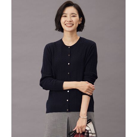 いつの時代も愛されるトラッドスタイルの、ミニケーブル柄のクルーネックカーディガン。ブランドロゴの入ったゴールド釦がコーディネートのアクセントに。羽織りとしてはもちろん、ボタンを閉めればトップスとしてもお使いいただける汎用性の高いアイテムです。同素材のハイネックニットとツイン風に合わせるのもおすすめ。