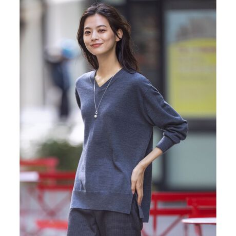 1枚で洒落見えする、スッキリとしたVネックニット。艶のあるウールと繊細で上品な印象の目面のハイゲージで、初秋から春先まで長く着られるアイテムです。ややゆったりとしたサイズ感で気になる腰回りをカバーでき、気温に合わせてレイヤードスタイルも楽しめます。サイドにスリットを入れ、前後差をつけてラウンドさせた裾で大人の抜け感を演出。ボトムスに前のみ裾をインしても素敵にきまります。女性らしいVネックにアクセサリーをプラスした、キレイめな着こなしもおすすめ。シンプルで飽きのこないデザインの万能ニットです。