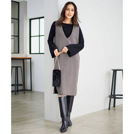 リバーシブルで着用可能なジャンパースカート■デザインたっぷりとしたボリューム感で、すっきりとしたシンプルなストレートラインのジャンパースカートです。衿とアームホールのラインを深めにデザインすることで、様々なインナーとレイヤードが可能です。ジャガードと無地の両面をリバーシブルで着用可能なので、気分に合わせたコーディネートを楽しめます。無地面はモックネックニット(KRWMSW0456)、フレアスリーブニット(KRWMSW0457)、ワイドパンツ(PRWMSW0451)と同素材になっており、セットアップとしても着て頂けます。■素材リバーシブル仕立てになっております。ジャガード面はスポンディッシュで軽量な発色の良いポリエステルの糸を使っています。ジャガードはシンプルなバイカラーながらも存在感があり、エッジに効かせたアクセントカラーがポイントになっています。無地面はビスコースにストレッチが入った適度な落ち感のあるエレガントな素材です。衿、アームホーム、脇に入った配色ラインがアクセントに効いています。■同素材アイテムスカート(SKWMSW0451)