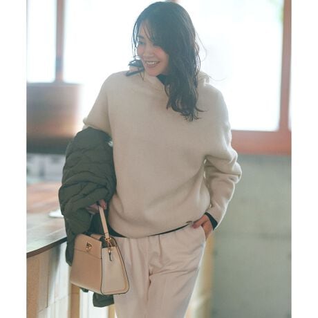 フェルトのような見た目がなんとも愛らしいニットパーカーです。襟は二重にしてボリュームを出し、首元が立つようにしています。身幅は横に広めのシルエットに。左裾のゴールドプレートやポケットもさり気ないポイントにしています。カラーはいずれも合わせやすいアイボリー(#002)、パーカー定番色のライトグレー(#003)、柔らかい印象のベージュ(#033)の3色展開です。