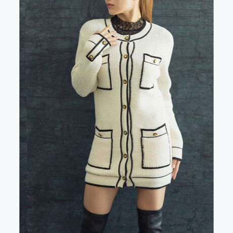 バイカラーが映える、遊びをきかせたロングニットカーディガン。
