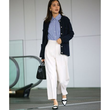 ■デザインメンズライクなムードはありながらも上品な女性らしさを漂わせるストレートワイドパンツ。太ももから裾に向かって真っすぐなストレートシルエットで、センターから少し脇の位置にタックからつながるようにプレスをいれ立体的にすることで、太めのシルエットもすっきりとした印象にしています。ベーシックなコーディネートにも取り入れやすく、ドレッシーすぎずカジュアルすぎない程よい佇まいが魅力です。