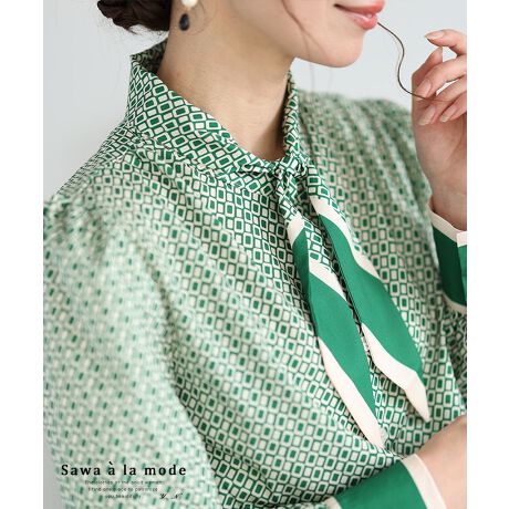 【ブラウス】 トップス シャツ 緑 グリーン 長袖 幾何学 ボウタイ レトロ エレガント 上品 秋服