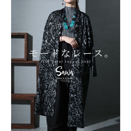 レースプリントのモードなトッパーコートです。ブラックベースにレース模様がプリントされたありそうでない1着。サッと羽織れる軽さも魅力の一つ。