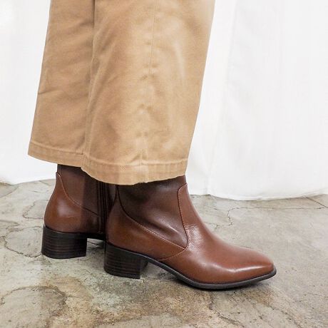 装飾のないシンプルなデザインでコーデの邪魔にならないショートブーツ。すっきりスクエアのトゥラインがスマートな印象。