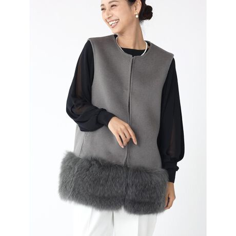 ウールの高密度な生地とフォックスファーをドッキングしたノーカラージレ。